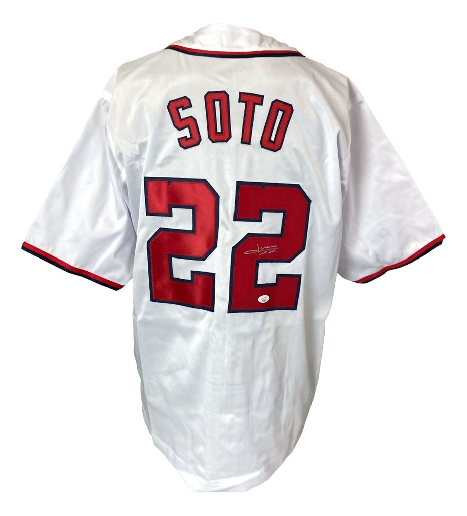 Featured is a Juan Soto signed custom baseball jersey. This jersey has been hand signed by Soto and comes with the JSA hologram and certificate of authenticity. This jersey features professionally sewn letters and numbers and is size XL. This jersey has no team tags or emblems and is intended as a sports collectible. This jersey would make a great addition to any sports memorabilia collection! SPECIFICATIONS Autographed By: Juan Soto Team: Washington Nationals Sport: Baseball Authentication: James Spence Authentication (JSA)