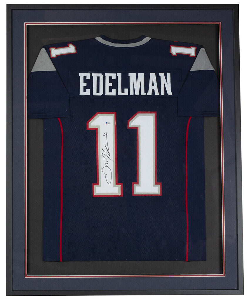 Featured is a Julian Edelman signed custom custom football jersey. This jersey was hand signed by Edelman and comes with the Beckett witnessed hologram and certificate of authentication. This jersey has been professionally framed and matted and is approximately 32x38. This jersey has hand sewn numbers and letter and has NO logos or any affiliation with any manufacturer or team. It is simply intended as an autographed collectible. SPECIFICATIONS Autographed By: Julian Edelman Team: New England Patriots Sport: Football Authentication: Beckett Grading Services