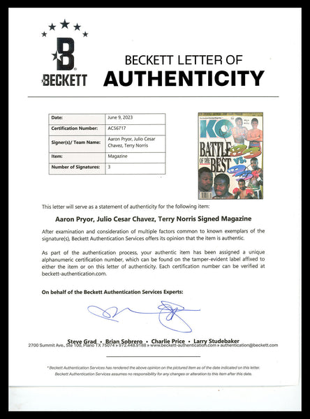 This is a KO magazine that has been hand signed by Julio Cesar Chavez, Aaron Pryor & Terry Norris. This item has been certified authentic by Beckett Authentication (BAS) and comes with their Tamper-Proof Hologram and matching full-page certificate of authenticity.