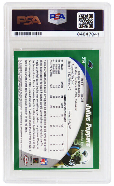 Julius Peppers signed Carolina Panthers 2002 Topps Chrome green refractor football rookie card #214. The card has been authenticated and encapsulated by PSA and the autograph has been given a GEM Mint 10 auto grade. The authentication number can be verified online. Only the autograph has been graded a 10 by PSA, the card itself is ungraded. The image of the item is a stock photo, as we may have multiples of the item in stock. The Slabbed Card you will receive will be of the card described. (Same grade, Same authentication) You may or may not receive the exact PSA serial number on the slab label shown in image.