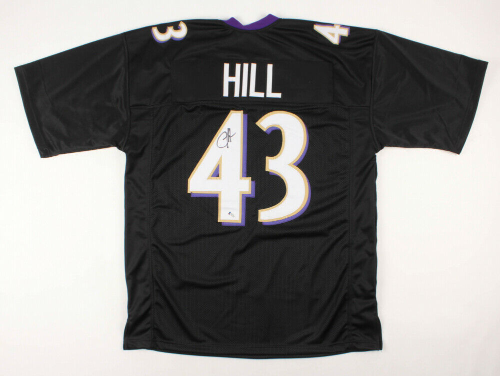 Custom on-field style jersey. Everything is sewn on, size XL. Hand-signed in black felt-tip pen by Justice Hill. The lot / autograph(s) includes an official Beckett Authentication Services serially numbered hologram and matching COA for authenticity purposes. The signing of this item was witnessed by Beckett.Authentication: Beckett COA Check out all the items in our Friendly Confines Collectibles store, Thanks for looking.
