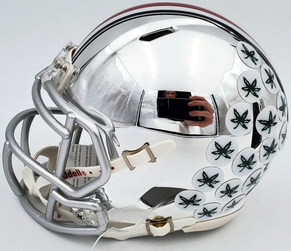 This is an Ohio State Buckeyes Chrome Silver Speed Mini Helmet that has been hand signed by Justin Fields. Please note, this chrome mini helmet is very reflective and displays nicer than what the pictures show. This item has been certified authentic by Beckett Authentication (BAS) and comes with their serial numbered sticker and matching certificate of authenticity.