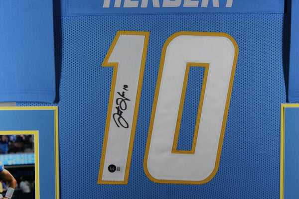 JUSTIN HERBERT AUTOGRAPHED & PROFESSIONALLY FRAMED PRO-STYLE JERSEY(Occasionally our own stock pictures are used at times due to quantity of framing, all frames will look identical as the one pictured)THE FRAMED JERSEY MEASURES 35"x 44" & COMES WITH THE FOLLOWING:-UV Protected Acrylic-Triple Acid Free Team Colored Matting-2 High Quality 8"x10" Photos-Team LogoEvery framed autographed jersey is accompanied with a tamper-proof hologram on the signed part of the jersey from one of the main authenticators in the industry (JSA, Beckett, PSA, etc.) and can be verified on their corresponding websites to prove authenticity.