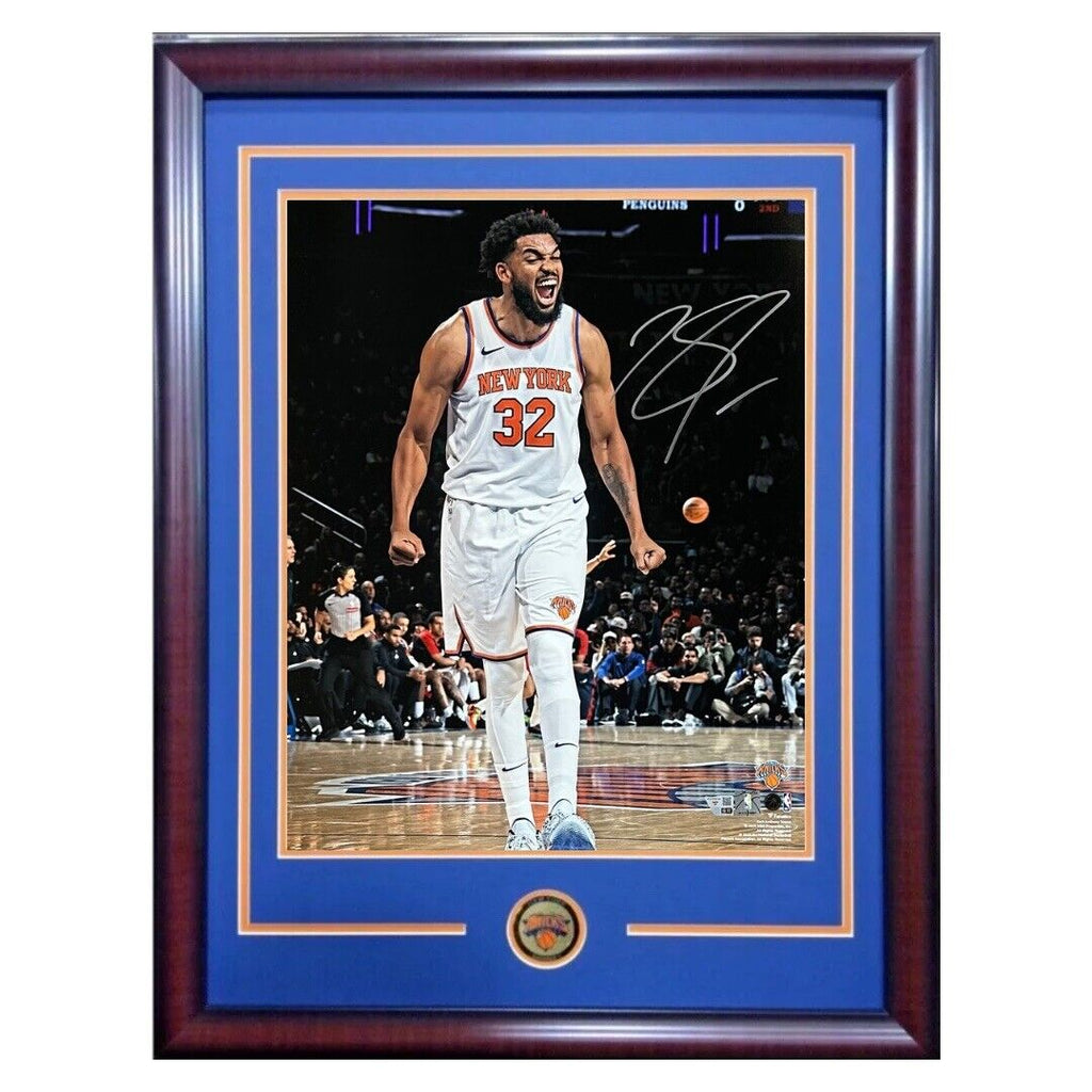 Karl Anthony Towns hand signed 16x20 framed spotlight photo. Great spotlight photo of him shooting vs the Heat. Hand signed by the star Knicks center Karl Anthony Towns in bold orange paint pen. Beautiful custom framed with cherrywood and Knicks colored matting as well as a Knicks coin. Final framed dimensions are 23x30... comes ready to hang.