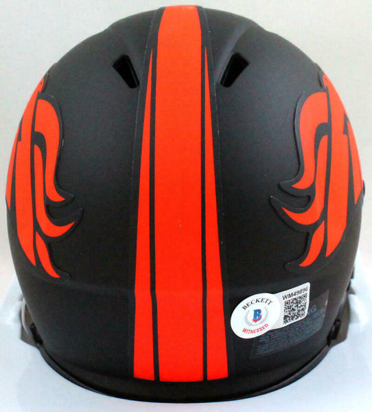 Karl Mecklenburg Autographed Denver Broncos Eclipse Speed Mini Helmet - Beckett W Auth *Orange This is a Karl Mecklenburg of the Denver Broncos hand autographed Riddell Football Eclipse Speed Mini Helmet. This item has a Beckett Witnessed Authentication, which comes with a numbered and a matching Beckett Certificate of Authenticity. You can view this item on the Beckett Authentication website and it shows when and where the item was signed. It was signed either at a public autograph appearance or a private signing. This is a stock photo of the item. Although you may not receive this exact item, the item you receive is virtually identical, brand new, and in great shape.