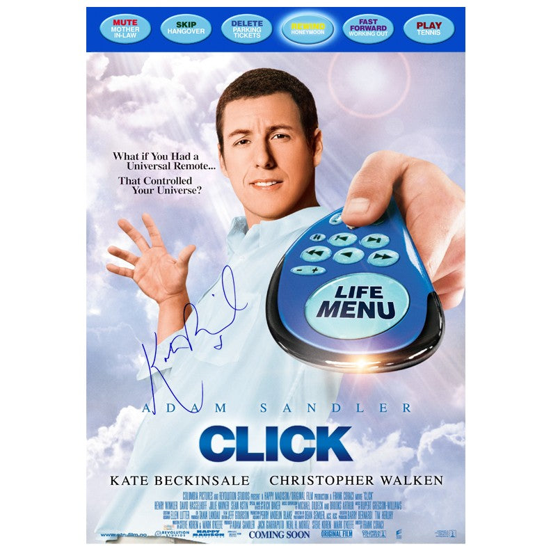 Celebrity Authentics is the exclusive autograph partner of Kate Beckinsale. Please be aware most other online autographs purported to be Ms. Beckinsale's are forgeries. Ms. Beckinsale has only signed with Celebrity Authentics so be sure the item you choose is affixed with the Celebrity Authentics Authentication Hologram for her genuine signature.This 2006 Click Original 27x40 Double-Sided Movie Poster has been personally autographed by award winning actress, the lovely Kate Beckinsale during her exclusive signing with Celebrity Authentics. Michael Newman seems to have it all but his wife, Donna, is increasingly frustrated by the amount of time he has to spend at work. Michael cannot find time to be at home until he meets an eccentric inventor who gives him a universal remote that controls time. At first he happily skips the boring times until he realizes the remote is in control of his life and he learns to cherish all the precious moments with his family. Poster is a new, undisplayed, genuine studio release that ships affixed with Celebrity Authentics serial-numbered Authentication hologram and includes Celebrity Authentics Certificate of Authenticity featuring picture of Kate signing poster.Please note: with multiples signed by the actor, a sample photo is used from stock to represent what you will receive. Exact autograph size and placement may vary.