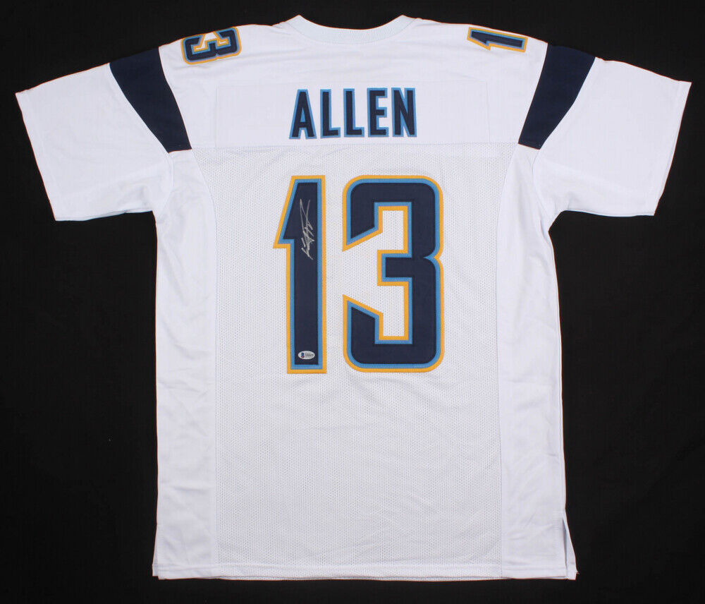 Custom on-field style jersey. Everything is sewn on, size XL. Hand-signed in silver felt-tip pen by Keenan Allen. The lot / autograph(s) includes an official Beckett Authentication Services serially numbered hologram and matching COA for authenticity purposes. The signing of this item was witnessed by Beckett.Authentication: Beckett COA