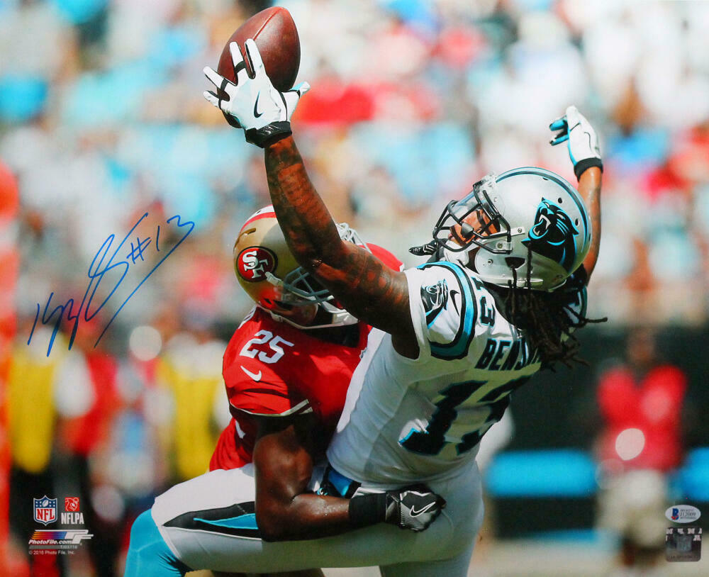 Kelvin Benjamin Autographed Carolina Panthers 16x20 PF Photo One Hand Catch- Beckett W *Blue This is a Hand Autographed 16x20 Photo of Kelvin Benjamin of the Carolina Panthers. This item has a Beckett Witness Authentication, which comes with a Beckett numbered and a matching COA card. You can view this item on the Beckett Authentication website and it shows when and where the item was signed. It was signed either at a public autograph appearance or a private signing. This is a stock photo of the item. Although you may not receive this exact item, the item you receive is virtually identical and brand new in great shape.