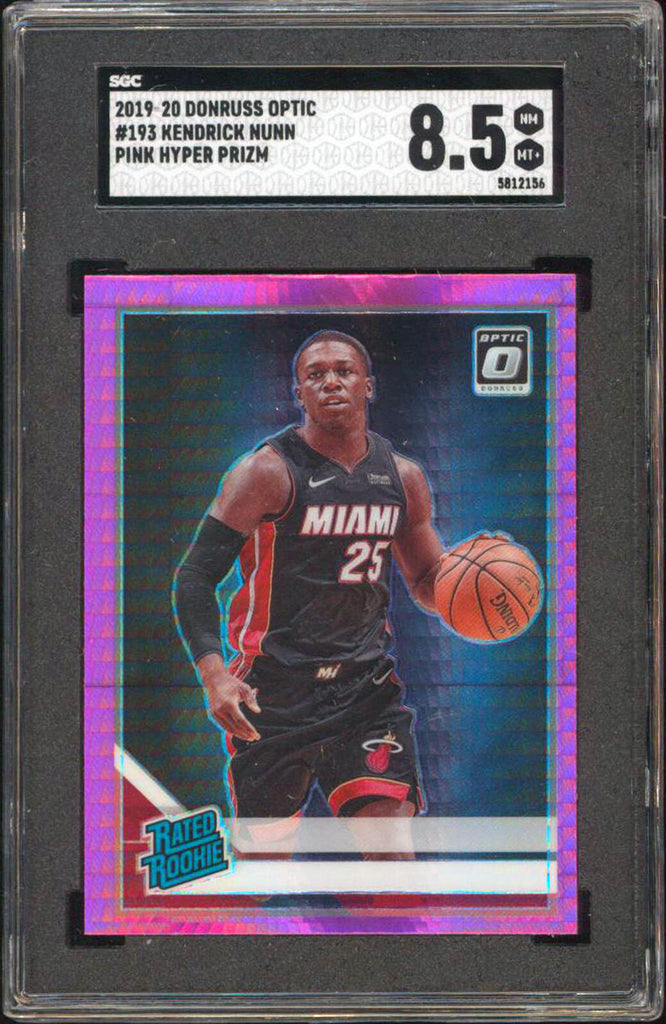 This is a Kendrick Nunn 2019 Donruss Optic #193 Pink Hyper Prizm Rookie Card of the Miami Heat . The 2019 Donruss Optic #193 Pink Hyper Prizm Rookie has been Graded NM-MT 8.5. The authenticity can be verified on SGC Authentic/Sportscard Guaranty website. This card is not autographed.