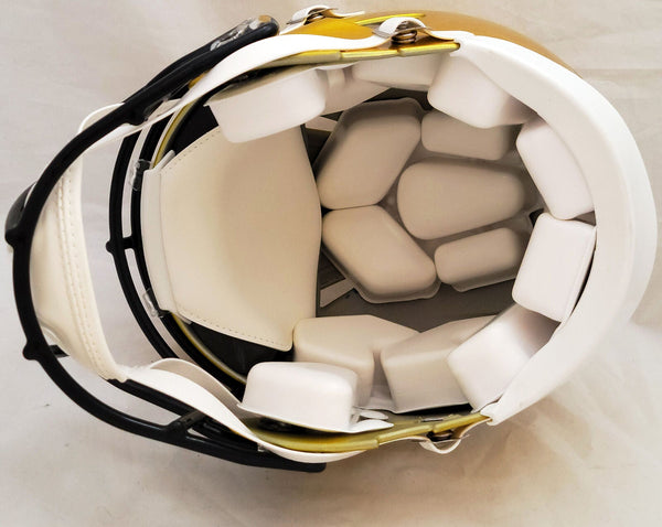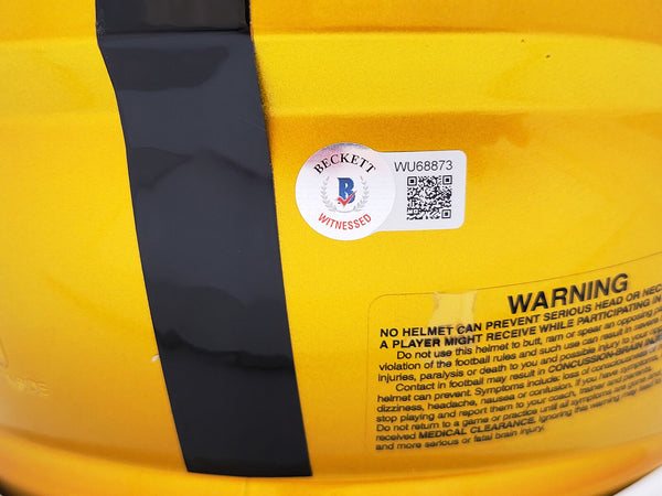This is a Pittsburgh Steelers Flash Yellow Full Size Authentic Speed Helmet that has been hand signed by Kenny Pickett. The Flash helmets are delicate and may have some marks or scratches on them. This item has been certified authentic by Beckett Authentication (BAS) and comes with their tamper-proof QR Code sticker that can be verified on the Beckett-authentication.com.
