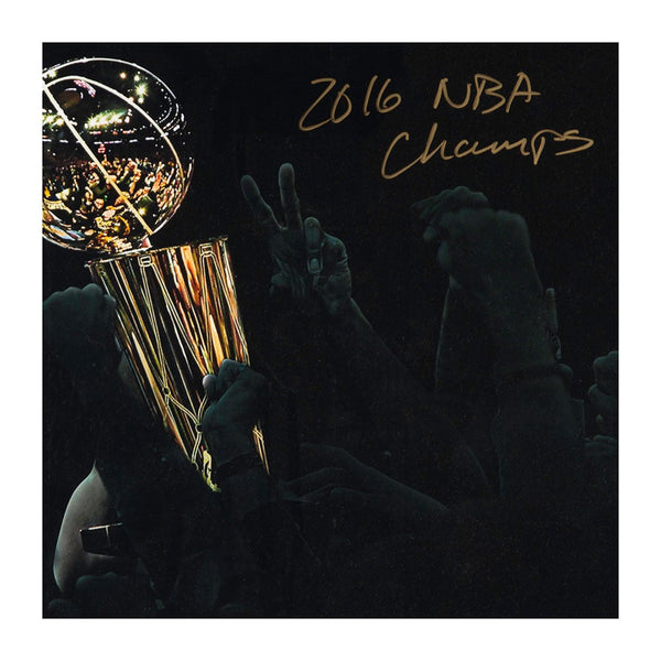 While LeBron James rightfully earned MVP honors and Kyrie Irving hit one of the most clutch shots in playoff history, the 2016 NBA Finals was equally won thanks to the efforts of Kevin Love. The Cavaliers All-Star power forward made clutch plays on offense down the stretch and helped challenge Stephen Curry every time he was guarding him, including making Curry rush a key shot down the stretch. The ultimate team player, Love is seen here celebrating with his teammates while lifting the Larry O'Brien Trophy high in the air after finally bringing Cleveland a championship. Love has signed and inscribed "2016 NBA Champs" on this limited edition (50) "Enduring" 30" x 15" image in gold paint pen. His signature is deemed authentic by virtue of Upper Deck Authenticated's Five-Step Process.