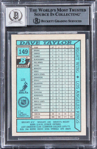 This Autographed Auto Graded Gem Mint 10! 1990 Bowman #149 Card has been Personally Signed by Dave Taylor of the Los Angeles Kings. This item is 100% Authentic, it comes slabbed and authenticated by Beckett Authentication Services. The authenticity can be verified on Beckett Authentication Services website.
