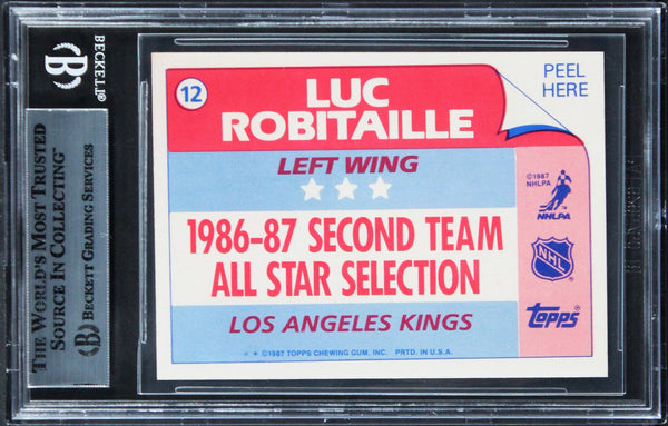 This Autographed 1987 Topps Sticker Inserts #12 Card has been Personally Signed by Luc Robitaille of the Los Angeles Kings. This item is 100% Authentic, it comes slabbed and authenticated by Beckett Authentication Services. The authenticity can be verified on Beckett Authentication Services website.