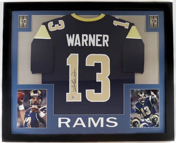 Custom frame measures 35" x 43" in size and features a jersey hand-signed by Kurt Warner.The autograph includes an official Beckett Authentication Services serially numbered hologram for authenticity purposes.Authentication: Beckett Hologram