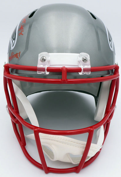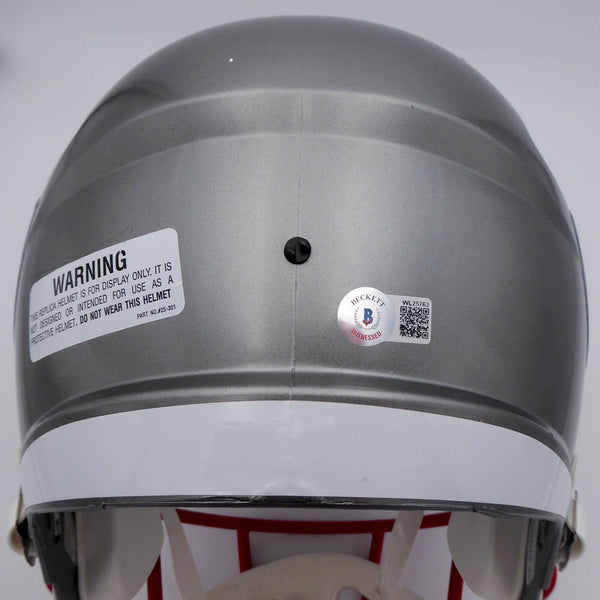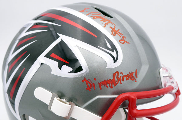 This is an Atlanta Falcons Flash Silver Full Size Replica Speed Helmet that has been hand signed by Kyle Pitts. The Flash helmets are very delicate and often have some marks or scratches on them. This item has been certified authentic by Beckett Authentication (BAS) and comes with their tamper-proof QR Code sticker that can be verified on the Beckett-authentication.com.?a NOTE: The signature and inscription appear to have been signed twice, as shown in the pictures.
