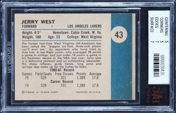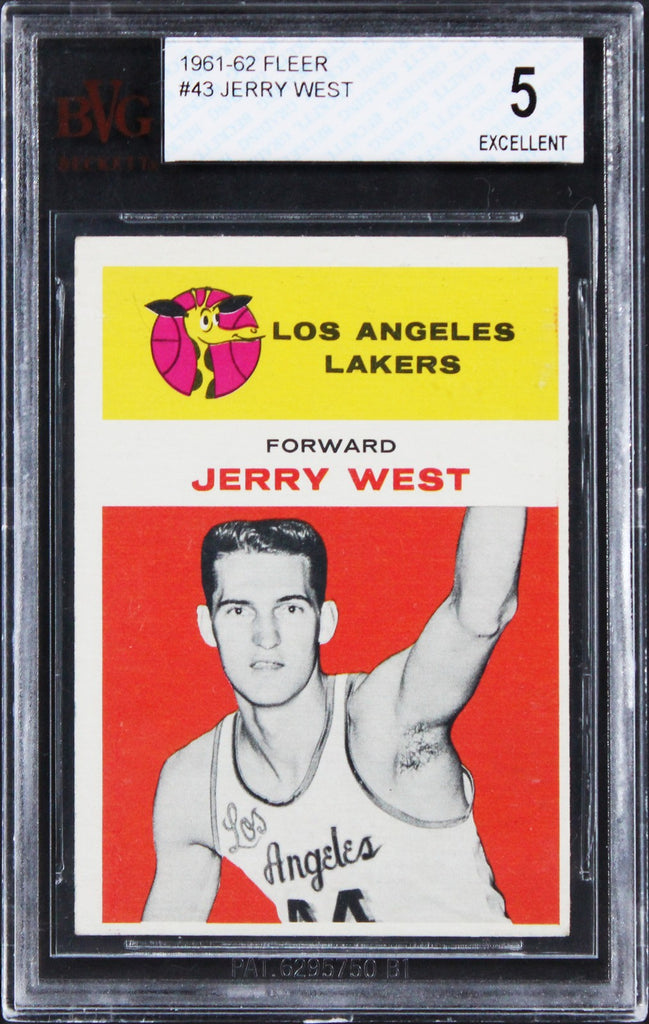 This is a 1961 Fleer #43 Rookie Graded EX-5 Card of Jerry West of the Los Angeles Lakers. This item is 100% Authentic, it comes slabbed and authenticated by Beckett Authentication Services. The authenticity can be verified on Beckett Authentication Services website. This card is not autographed.
