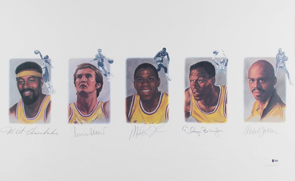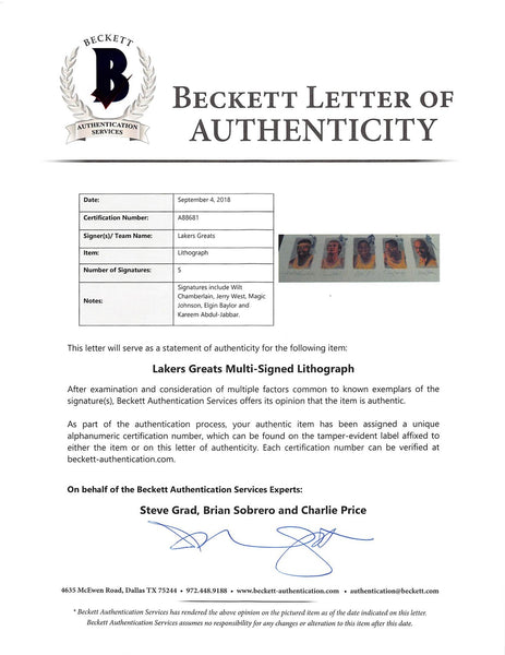 This Autographed & Framed 22x39 Lithograph has been Personally Signed by Wilt Chamberlain, Kareem Abdul-Jabbar, Magic Johnson, Jerry West & Elgin Baylor of the Los Angeles Lakers. This item is 100% Authentic to include a Certificate of Authenticity (COA) / hologram by Beckett Authentication Services. We have multiples of this same item. While the photographs are representative of this item, the size, placement and strength of the signature may vary. Each item is hand signed, therefore, each autograph is unique. This item has been professionally framed to overall dimensions of approximately 33.5 x 44.5 inches. Sample Letter of Authenticity attached.