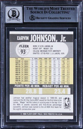 This Autographed Auto Graded Gem Mint 10! 1990 Fleer #93 Card has been Personally Signed by Magic Johnson of the Los Angeles Lakers. This item is 100% Authentic, it comes slabbed and authenticated by Beckett Authentication Services. We have multiples of this same item. While the photographs are representative of this item, the size and placement of the signature may vary. Each item is hand signed, therefore, each autograph is unique.