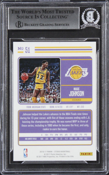 This Autographed 2016 Studio #51 Card has been Personally Signed by Magic Johnson of the Los Angeles Lakers. This item is 100% Authentic, it comes slabbed and authenticated by Beckett Authentication Services. We conducted an autograph signing with Magic Johnson where multiples of the same item were signed. While the photographs are representative of this item, the size, placement and strength of the signature may vary. Each item is hand signed, therefore, each autograph is unique. This item can be verified through BAS Slabbed.