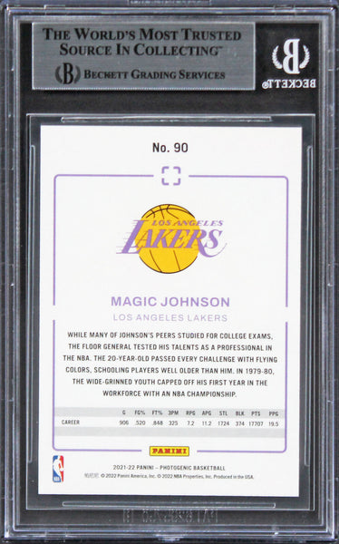 This Autographed 2021 Panini Photogenic #90 Card has been Personally Signed by Magic Johnson of the Los Angeles Lakers. This item is 100% Authentic, it comes slabbed and authenticated by Beckett Authentication Services. The authenticity can be verified on Beckett Authentication Services website.