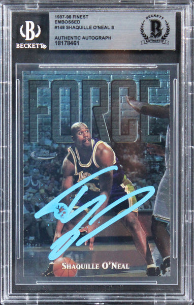 This Autographed 1997 Finest Embossed #148 Card has been Personally Signed by Shaquille O'Neal of the Los Angeles Lakers. This item is 100% Authentic, it comes slabbed and authenticated by Beckett Authentication Services. The authenticity can be verified on Beckett Authentication Services website.