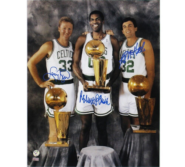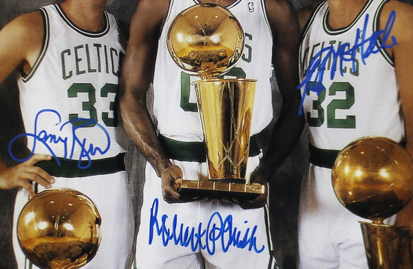 A Boston Celtics Unframed 16x20 NBA Photo hand signed by Larry Bird, Kevin McHale & Robert Parish. The item and signature are in excellent condition. AUTHENTICATION: The item is accompanied by a New England Pictures Certificate of Authenticity- New England Pictures and a Larry Bird Serial Numbered Hologram