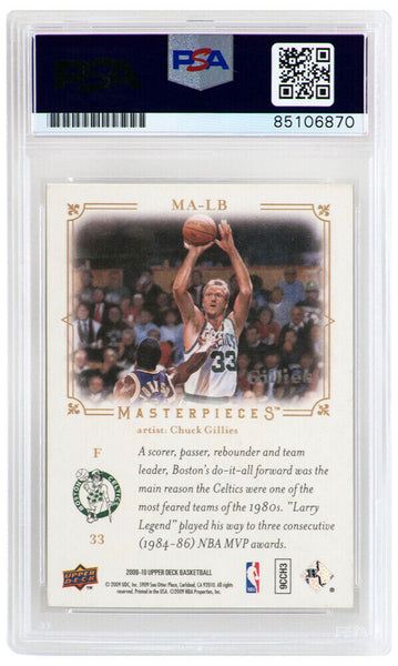 Larry Bird signed Boston Celtics 2009 Upper Deck Masterpieces with Magic Johnson basketball trading card #MA-LB. The card has been authenticated and encapsulated by PSA/DNA and the number can be verified online.