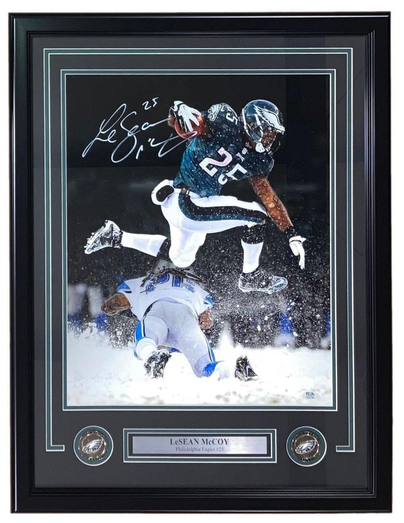 Featured is a LeSean McCoy signed 16x20 Philadelphia Eagles photo. This photo has been hand signed by McCoy and comes with the PSA/DNA hologram. This photo has been professionally framed and matted and is approximately 22x29. This photo would make a great addition to any sports memorabilia collection!. SPECIFICATIONS Autographed By: LeSean McCoy Team: Philadelphia Eagles Sport: Football Authentication: PSA/DNA Authentication Services