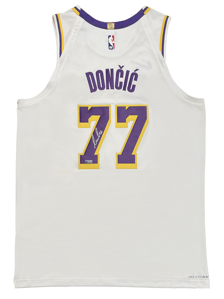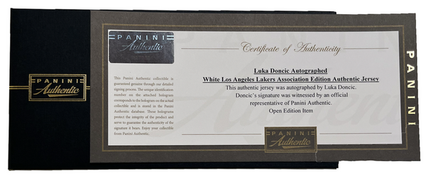 Luka Doncic Autographed Los Angeles Lakers White Nike Authentic Jersey Panini is a Los Angeles Lakers White Nike authentic jersey hand signed by Luka Doncic.This autographed jersey includes a Panini Authentic certificate of authenticity with a unique hologram number that corresponds to the hologram on the actual collectible. These holograms protect the integrity of the product and serve to guarantee the authenticity of the signature it bears. MONEY BACK GUARANTEE! If for any reason you are not completely satisfied with the quality or authenticity of your purchase, we will gladly give you a full refund or exchange, whichever you prefer up to 30 days after purchase. Please feel free to e-mail us with any questions. Thank you. Authenticator Pre-Certified Authenticator: Panini Authenticated History of item: Luka Doncic has signed this item in the presence of a representative from Panini Authenticated. Describe how you came to possess this item: Super Sports Center is a fully authorized dealer for Upper Deck Authenticated as well as Panini Authenticated, Mounted Memories and Steiner Sports. Other information about you and / or the item: Super Sports Center strives to deliver the most authentic in sports memorabilia from trusted companies like Mounted Memories, Steiner Sports and Upper Deck Authenticated. If it exists, we can find it for you!