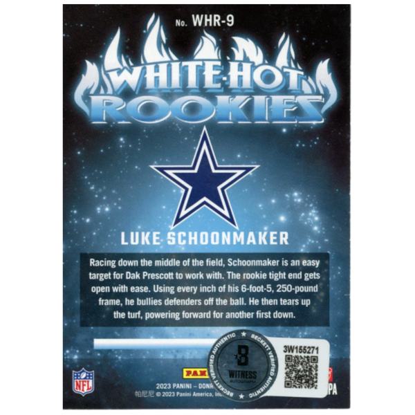 The number in the listing title is just an inventory sku for our records and is not the authentication number. The item pictured is a stock photo unless otherwise noted. This is a Dallas Cowboys 2023 Donruss #WHR-9 Trading Card that was personally autographed by Luke Schoonmaker. Includes a certificate of authenticity from Beckett Authentication Services (BAS) and Denver Autographs. FREE SHIPPING within the USA on orders over $10!