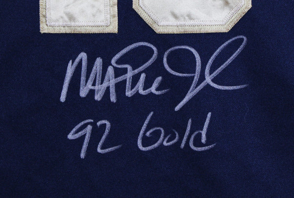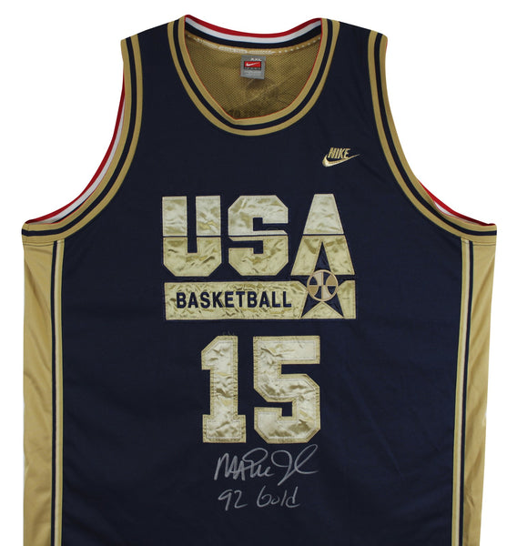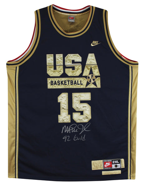 This Autographed Navy & Gold Nike Team USA Dream Team Jersey with the inscription of "92 Gold" has been Personally Signed by Magic Johnson of the Los Angeles Lakers. This item is 100% Authentic to include a hologram by Beckett Authentication Services. This item will come with an affixed Beckett Authentication Services (BAS) authentication sticker, which includes a scannable QR code to verify authenticity. Please note that Beckett no longer provides serial-numbered COA cards, and the attached BAS sticker will serve as the complete authentication for this item. This is a BAS Witnessed Protection Program item which means a Beckett Authentication Service representative was present when this item was being signed. The authenticity can be verified on Beckett Authentication Services website. This is a XX-Large sized Jersey. There is a stray pen mark on the 5 on the back side of the jersey. Please refer to photos for item's condition prior to purchase.