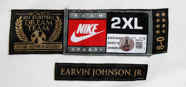 This Autographed White Nike Team USA Dream Team Jersey with the inscription of "92 Gold" has been Personally Signed by Magic Johnson of the Los Angeles Lakers. This item is 100% Authentic to include a hologram by Beckett Authentication Services. This item will come with an affixed Beckett Authentication Services (BAS) authentication sticker, which includes a scannable QR code to verify authenticity. Please note that Beckett no longer provides serial-numbered COA cards, and the attached BAS sticker will serve as the complete authentication for this item. This is a BAS Witnessed Protection Program item which means a Beckett Authentication Service representative was present when this item was being signed. The authenticity can be verified on Beckett Authentication Services website. This is a XX-Large sized Jersey.
