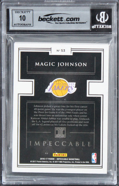 This Autographed Auto Graded Gem Mint 10! 2016 Panini Impeccable Silver NBA Logo #53 #12/16 Card has been Personally Signed by Magic Johnson of the Los Angeles Lakers. This item is 100% Authentic, it comes slabbed and authenticated by Beckett Authentication Services. The authenticity can be verified on Beckett Authentication Services website.
