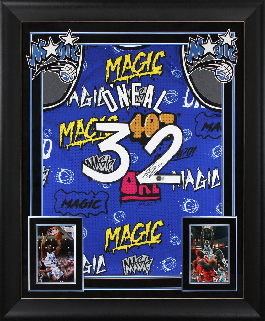 This Autographed Alternate Blue Mitchell & Ness 1994-95 Hardwood Classics Swingman Framed Jersey has been Personally Signed by Shaquille O'Neal of the Orlando Magic. This item is 100% Authentic to include a hologram by Beckett Authentication Services. This item will come with an affixed Beckett Authentication Services (BAS) authentication sticker, which includes a scannable QR code to verify authenticity. Please note that Beckett no longer provides serial-numbered COA cards, and the attached BAS sticker will serve as the complete authentication for this item. This is a BAS Witnessed Protection Program item which means a Beckett Authentication Service representative was present when this item was being signed. We conducted an autograph signing with Shaquille O'Neal where multiples of the same item were signed. While the photographs are representative of this item, the size, placement and strength of the signature may vary. Each item is hand signed, therefore, each autograph is unique. This item can be verified through BAS Witnessed. This item has been professionally framed to overall dimensions of approximately 32 x 37 inches. This is a X-Large sized Framed Jersey. This jersey will be framed to order, it will take approximately 3-4 business days from purchase date for it to ship.