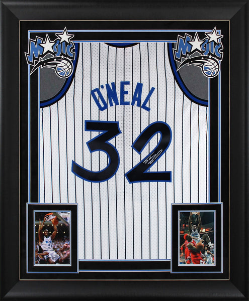 This Autographed White Mitchell & Ness 1993-94 Throwback Hardwood Classics Swingman Framed Jersey has been Personally Signed by Shaquille O'Neal of the Orlando Magic. This item is 100% Authentic to include a hologram by Beckett Authentication Services. This item will come with an affixed Beckett Authentication Services (BAS) authentication sticker, which includes a scannable QR code to verify authenticity. Please note that Beckett no longer provides serial-numbered COA cards, and the attached BAS sticker will serve as the complete authentication for this item. This is a BAS Witnessed Protection Program item which means a Beckett Authentication Service representative was present when this item was being signed. We conducted an autograph signing with Shaquille O'Neal where multiples of the same item were signed. While the photographs are representative of this item, the size, placement and strength of the signature may vary. Each item is hand signed, therefore, each autograph is unique. This item can be verified through BAS Witnessed. This item has been professionally framed to overall dimensions of approximately 32 x 37 inches. This is a X-Large sized Framed Jersey. This jersey will be framed to order, it will take approximately 3-4 business days from purchase date for it to ship.