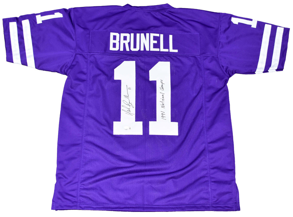 Mark Brunell, former star quarterback back for the Huskies, has hand signed this purple custom jersey at a private signing. He included the inscription "1991 National Champs" with his signature. Jersey is size XL and all letters/numbers are screen print. This item is authenticated by Beckett Authentication Services and was signed in the presence of one of their representatives. Their tamper-evident hologram featuring a QR code and serial number is on the item. The authenticity can be verified online by entering the serial number or scanning the QR code.Item pictured may not be the exact item you will receive. It will be similar quality, and we guarantee your satisfaction.
