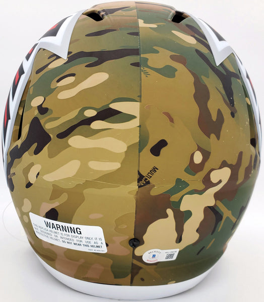 This is an Atlanta Falcons Camo Full Size Replica Speed Helmet that has been hand signed by Matt Ryan. Because each Camo helmet is hand-dipped using water-transfer technology there may be slight imperfections. This item was inscribed "2016 NFL MVP." This item has been certified authentic by Beckett Authentication (BAS) and comes with their tamper-proof QR Code sticker that can be verified on the Beckett-authentication.com.