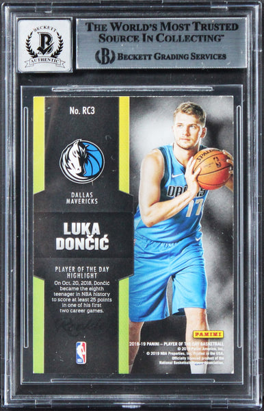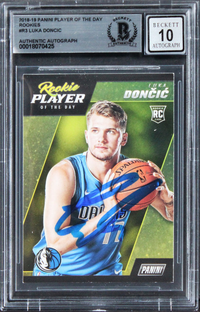 This Autographed Auto Graded Gem Mint 10! 2018 Panini Player Of The Day Rookies #R3 Rookie Card has been Personally Signed by Luka Doncic of the Dallas Mavericks. This item is 100% Authentic, it comes slabbed and authenticated by Beckett Authentication Services. We conducted an autograph signing with Luka Doncic where multiples of the same item were signed. While the photographs are representative of this item, the size, placement and strength of the signature may vary. Each item is hand signed, therefore, each autograph is unique. This item can be verified through BAS Slabbed.