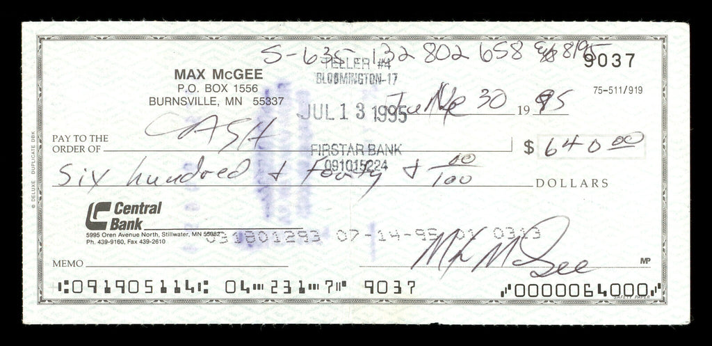 This is a 2.75x6 Check that has been hand signed by Max McGee. This item is guaranteed to pass any third party authentication company including Beckett, PSA/DNA & JSA authentication.