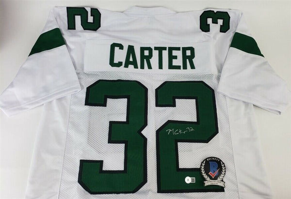 This autographed jersey has been personally hand-signed by Michael Carter of the New York Jets. This autograph is certified by Beckett Authentication Services (BAS) Witness Certification. That means that a Beckett representative was present when this item was signed. It comes with the numbered authentication hologram with a QR code that verifies the authentication on the Beckett website.Custom on-field style jerseys are a more affordable option for autograph seekers. These jerseys do not have any brand name or tags and are made in the Philippines. They feature stitched on names and numbers and are made to look very similar to the on-field jerseys that the players wear. These custom jerseys are very commonly used in the memorabilia industry.