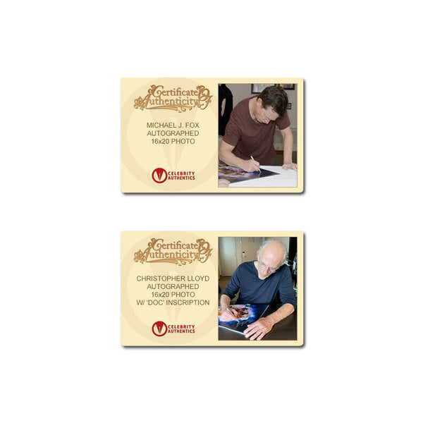 From the Framing Studios of Celebrity Authentics is this 16"x"20" Framed Photo (approximately 27"x22.5" finished) of Doc Brown and Marty McFly from Back to the Future, personally hand-signed by Christopher Lloyd and Michael J. Fox during their signings with Celebrity Authentics. In this 1980s sci-fi classic, small-town California teen Marty McFly (Michael J. Fox) is thrown back into the '50s when an experiment by his eccentric scientist friend Doc Brown (Christopher Lloyd) goes awry. Traveling through time in a modified DeLorean car, Marty encounters young versions of his parents (Crispin Glover, Lea Thompson), and must make sure that they fall in love or he'll cease to exist. Even more dauntingly, Marty has to return to his own time and save the life of Doc Brown. Ships affixed with the Celebrity Authentics serial-numbered and tamper evident Authentication Hologram and includes Celebrity Authentics Certificates of Authenticity featuring picture of Christopher and Michael signing photo. Framing: Photo is meticulously dry mounted and framed using acid free backing and mat boards with white core for the finest in presentation. UV protective glass with precision cut moulding are used for smooth, clean frame edges, hand assembled in our studio. Additionally, a protective back cover is used to seal the piece with corner bumpers applied to protect your walls, providing adequate air flow. A hanger is affixed to complete the finished collectible. Each framed photo is carefully wrapped for shipping with double protective corners and cushioning to help ensure the item's safe arrival. Celebrity Authentics Framing Studios - acclaimed as the industry's finest! Please note: with multiples signed by the actor, a sample photo is used from stock to represent what you will receive. Exact autograph size and placement may vary.