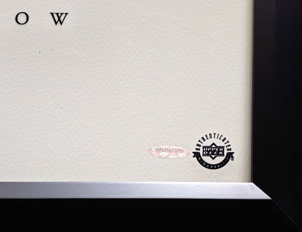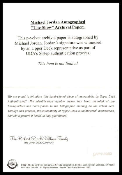This is a Framed 20x46 "The Show" Poster Photo that has been hand signed by Michael Jordan. Please note, there are a couple of very small scratches in the frame as shown. This item has been certified authentic by Upper Deck Authentication (UDA) and comes with their tamper-proof hologram and matching full-page certificate of authenticity.