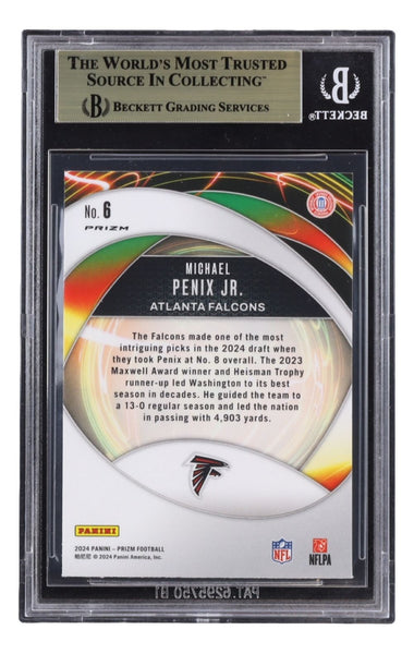 Featured is a Michael Penix Jr 2024 Panini Prizm Portals Green Ice #6 Atlanta Falcons rookie card. This card has been encapsulated by Beckett, receiving a condition grade of Gem Mint 9.5. This card would make a great addition to any sports memorabilia collection! SPECIFICATIONS Autographed By: Michael Penix Jr Team: Atlanta Falcons Sport: Football Authentication: Becket Grading Services (BGS)