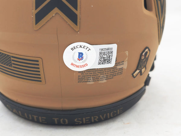 This is an Atlanta Falcons Camo Brown Speed Mini Helmet that has been hand signed by Michael Vick. Because each Camo helmet is hand-dipped using water-transfer technology there may be slight imperfections. This item has been witnessed and certified authentic by Beckett Authentication (BAS) and comes with their tamper-proof witness sticker.