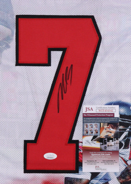 Custom on-field style jersey. Everything is sewn on, size XL. Hand-signed in silver paint pen by Michael Vick. The lot / autograph(s) includes an official James Spence Authentication (JSA) hologram and matching COA for authenticity purposes. The signing of this item was witnessed by JSA.Authentication: JSA COA