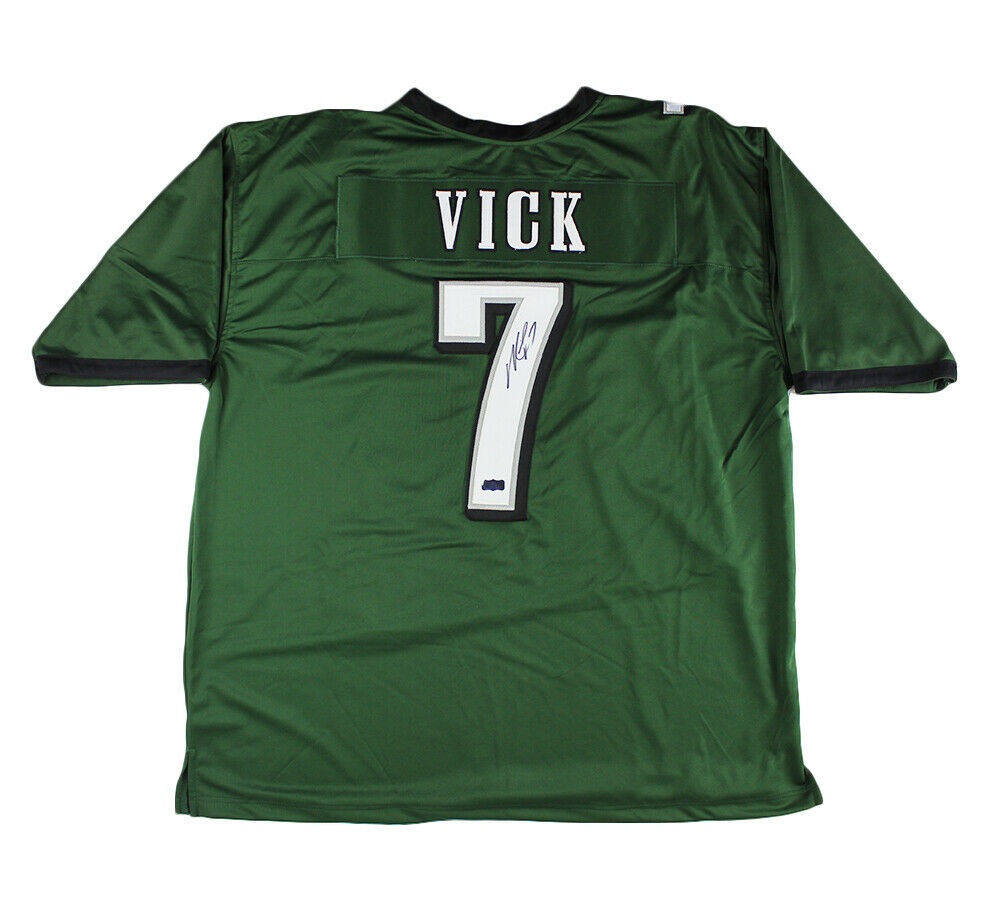 A Philadelphia Custom Green Jersey hand signed by Michael Vick. The item and signature are in excellent condition. Michael is a former professional football quarterback who played 13 seasons in the NFL, primarily with the Atlanta Falcons and the Philadelphia Eagles. He played college football at Virginia Tech and was selected by the Falcons as the first overall pick in the 2001 NFL Draft. He is a 4x Pro Bowl (2002, 2004, 2005, 2010), NFL Comeback Player of the Year (2010), Heisman Trophy finalist (1999), Big East Offensive Player of the Year (1999), and Big East Rookie of the Year (1999). AUTHENTICATION: The item is accompanied by a Certificate of Authenticity - Serial Numbered and Databased Hologram
