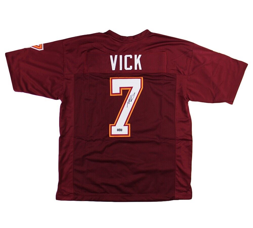 A Virginia Tech Custom Maroon Jersey hand signed by Michael Vick. The item and signature are in excellent condition. Michael is a former professional football quarterback who played 13 seasons in the NFL, primarily with the Atlanta Falcons and the Philadelphia Eagles. He played college football at Virginia Tech and was selected by the Falcons as the first overall pick in the 2001 NFL Draft. He is a 4x Pro Bowl (2002, 2004, 2005, 2010), NFL Comeback Player of the Year (2010), Heisman Trophy finalist (1999), Big East Offensive Player of the Year (1999), and Big East Rookie of the Year (1999). AUTHENTICATION: The item is accompanied by a Certificate of Authenticity - Serial Numbered and Databased Hologram