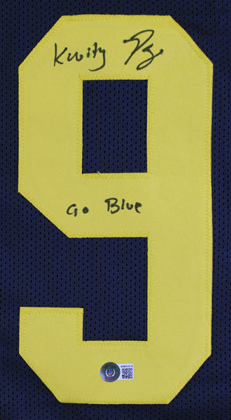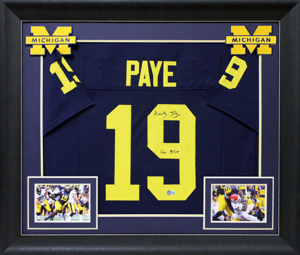 This Autographed Navy Blue Pro Style Framed Jersey with the inscription of "Go BLue" has been Personally Signed by Kwity Paye of the Michigan Wolverines. This item is 100% Authentic to include a hologram by Beckett Authentication Services. This item will come with the new Beckett Authentication hologram that has a scannable QR code rather than the traditional COA. If you would like to have a COA, you are welcome to reach out to Beckett for a printed certification once you receive your item. This is a BAS Witnessed Protection Program item which means a Beckett Authentication Service representative was present when this item was being signed. We conducted an autograph signing with Kwity Paye where multiples of the same item were signed. While the photographs are representative of this item, the size, placement and strength of the signature may vary. Each item is hand signed, therefore, each autograph is unique. This item can be verified through BAS Witnessed. This item has been professionally framed to overall dimensions of approximately 32 x 37 inches. This is a X-Large sized, non-branded, custom-stitched Framed Jersey. This jersey will be framed to order, it will take 3-4 days from purchase date for it to ship.