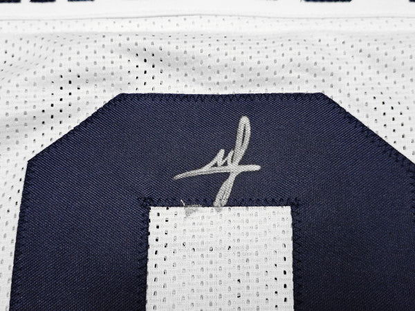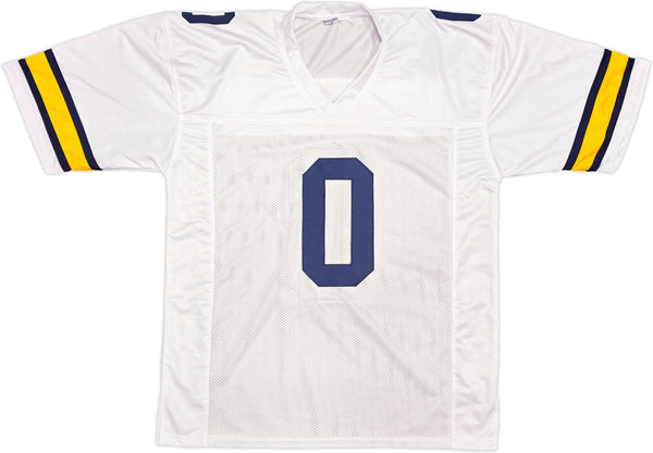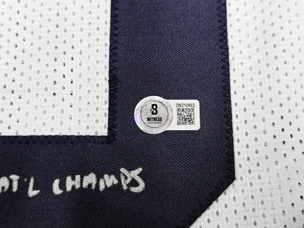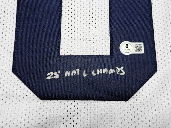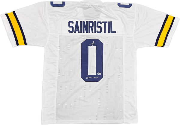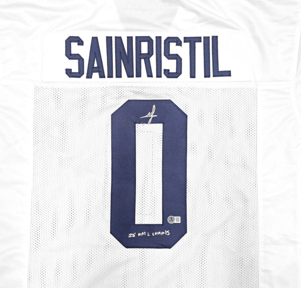 This is a White Jersey that has been hand signed by Mike Sainristil. This is a custom jersey with no name brand. The approximate size is XL. It has nice sewn in name and numbers. This item was inscribed "23 Natl Champs." This item has been witnessed and certified authentic by Beckett Authentication (BAS) and comes with their tamper-proof witness hologram.