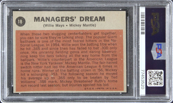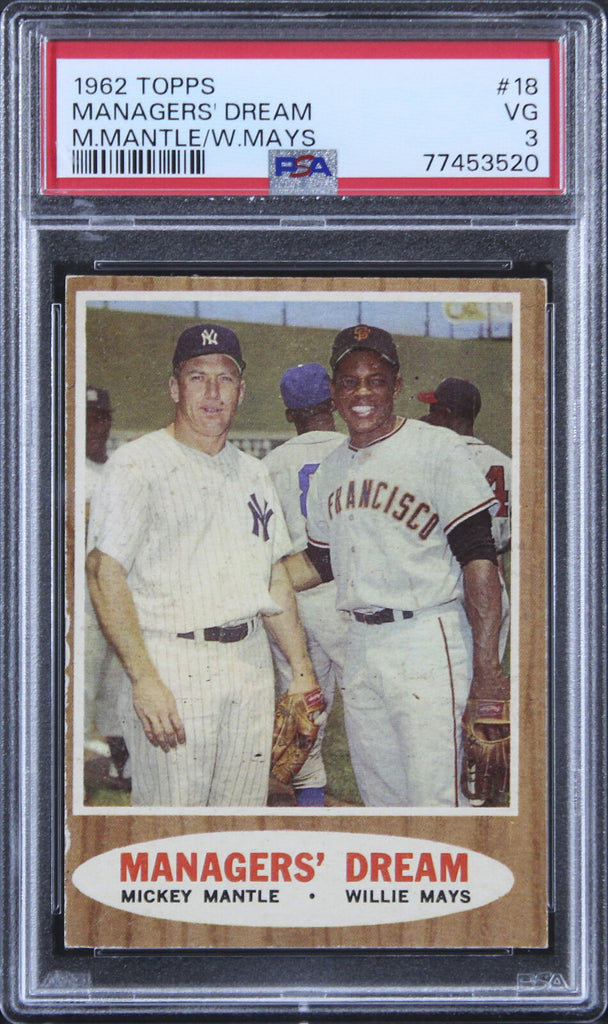 This is a 1962 Topps #18 Managers' Dream Graded VG-3 Card of Mickey Mantle & Willie Mays. This item is 100% Authentic, it comes slabbed and authenticated by PSA. This item is not autographed. The authenticity can be verified on Professional Sports Authenticator website.